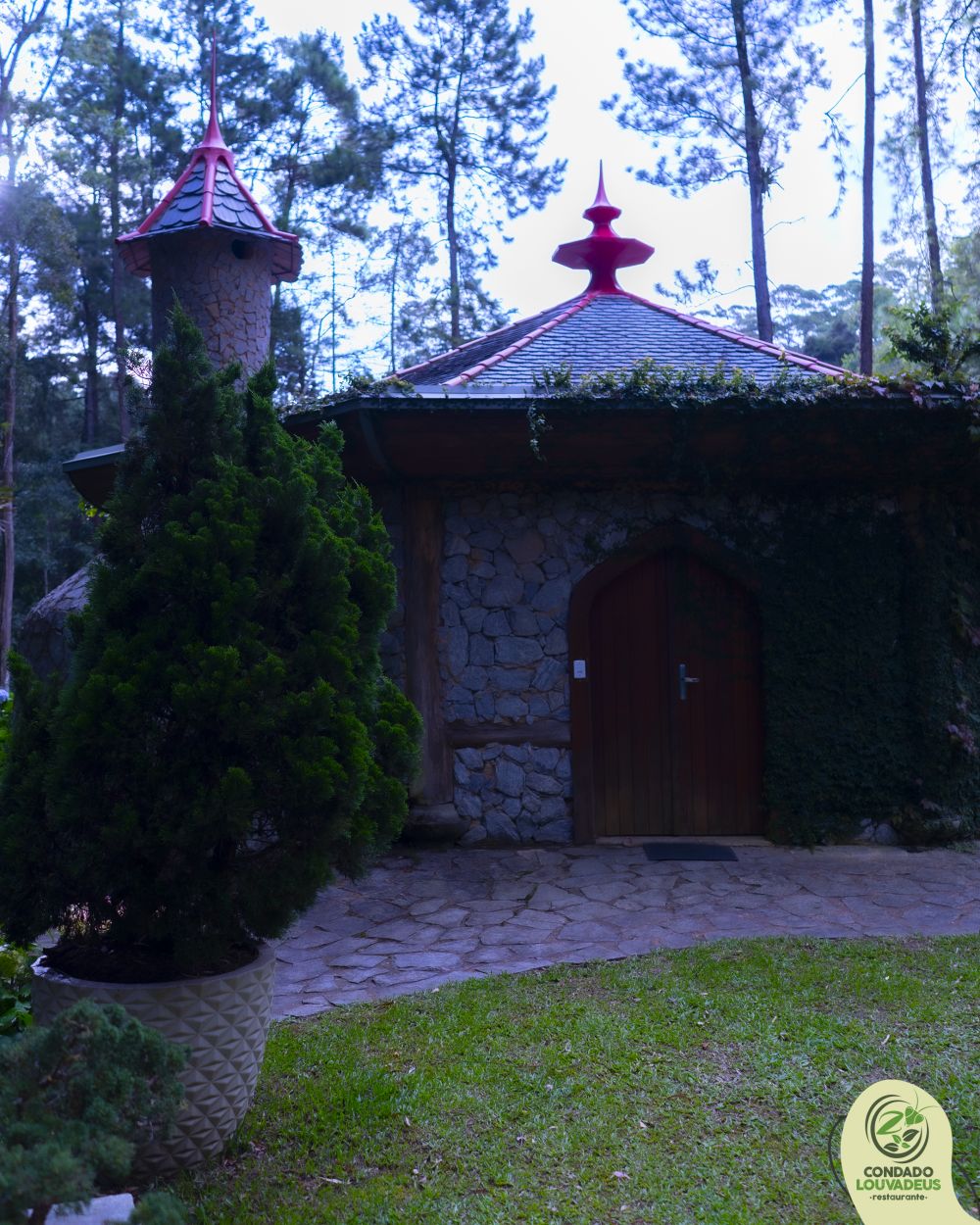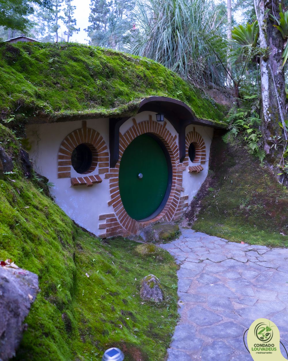 Com tanta beleza, pensamos em dividir com as pessoas esse ambiente com um restaurante feito em octógono, com paredes de pedra e hera, e charme todo especial para banheiros e cozinha baseados no filme O Senhor dos Anéis, reproduzindo as Tocas Hobbit do Condado, puro encanto!!!